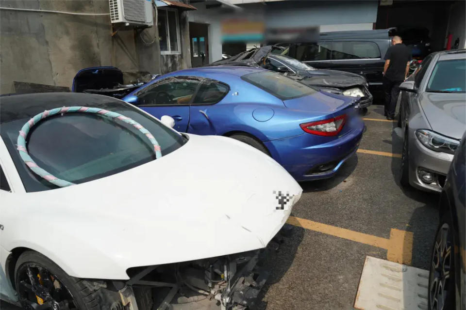 涉案维修厂内存放的事故豪车(央广网发 上海警方供图)