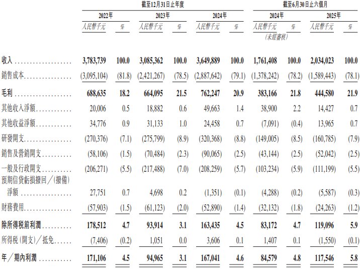 财务方面,于2022年、2023年、2024年及2025年截至6月30日止六个月,该公司收入分别约为37.84亿元、30.85亿元、36.5亿元、20.34亿元人民币;同期,年╱期内利润分别约为1.71亿元、9496.5万元、1.67亿元、1.18亿元人民币。